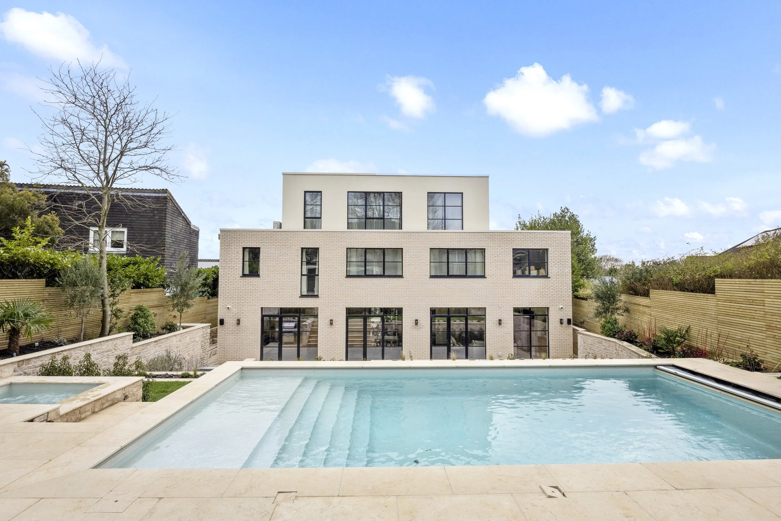 The property’s exterior is a stunning display of modern architecture. Clean lines, elegant brickwork, and expansive windows framed in black metal create a refined aesthetic, while exterior lighting accentuates the design's sleek contours at sunset. The rear elevation reveals a luxurious swimming pool and integrated hot tub, surrounded by elegant paving and lush landscaping, offering an idyllic setting for both relaxation and entertainment.